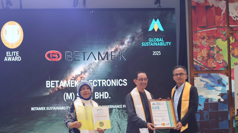 KUALA LUMPUR, MY / ACCESS Newswire / January 8, 2026 / Betamek Berhad ("Betamek" or the "Company"), an Original Design Manufacturer ("ODM") and a leading player in electronics manufacturing services ("EMS") for the automotive industry, is pleased to announce that its wholly-owned subsidiary, Betamek Electronics (M) Sdn. Bhd. ("BESB"), has been awarded the Elite Award, the highest honour under the Malaysia Global Sustainability Awards 2025 ("MGSA 2025"), in recognition of its project titled "Betamek Sustainability Integration & ESG Governance Framework."