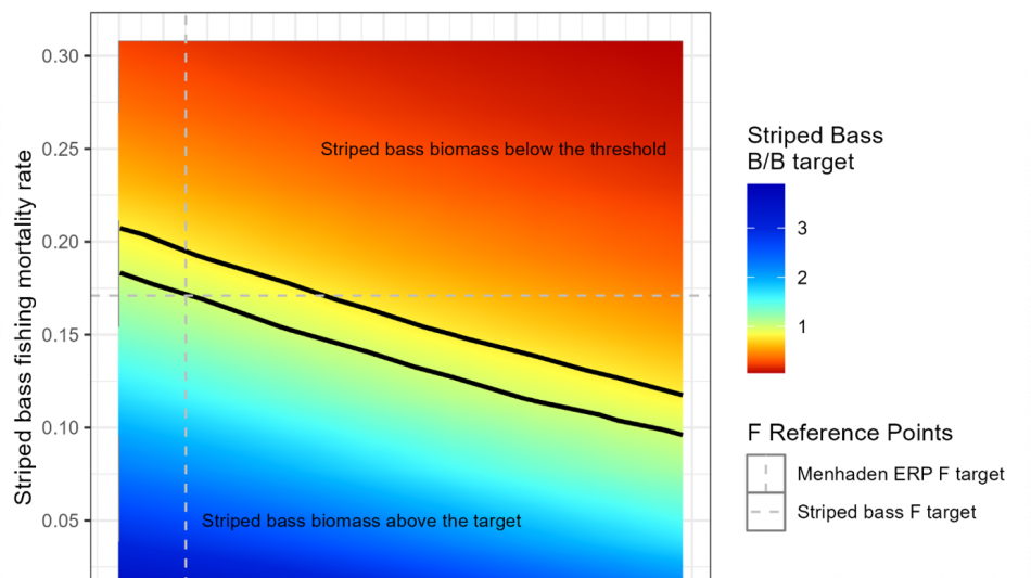 A lot of confusion has also centered on the so-called "rainbow plot" from the ERP assessment. That plot has been waved around as if it proves menhaden fishing is too high. The Technical Committee's own explanation makes clear that it shows something much more basic: for striped bass to reach their own biomass goals, striped bass fishing mortality must come down, no matter what you do with menhaden.
