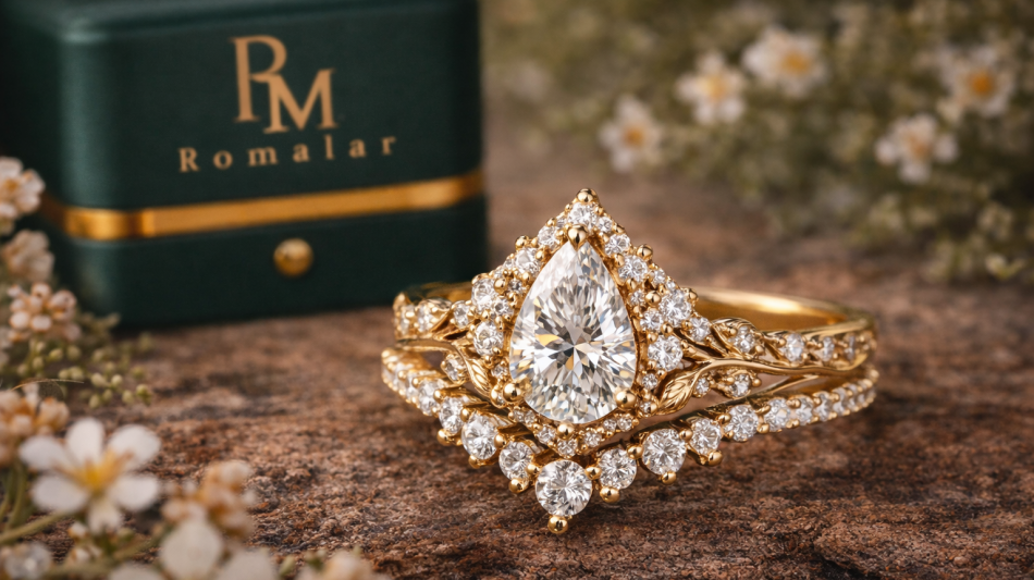 Romalar Jewelry's design language centers on creating rings that feel visually expressive rather than generic. Across its collections, the brand highlights elements such as marquise, pear, emerald, kite, and other distinctive cuts, along with ornate settings, vine and leaf motifs, layered details, and styles intended for customers who want something beyond a standard bridal look.