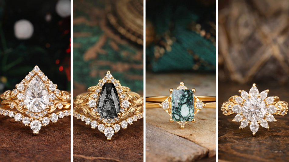 This shift has contributed to rising interest in non-traditional engagement rings, including designs with alternative center stones, vintage-inspired details, expressive band structures, and more personalized visual character. Romalar Jewelry's own product direction reflects this broader movement, with styles spanning moissanite, moss agate, black rutilated quartz, alexandrite, and other gemstone options across categories such as nature-inspired, cluster, halo, and three-stone rings.