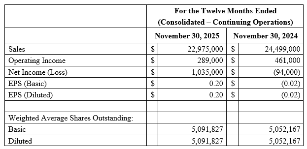 Net Income (Loss) per Share - continuing operations: Net income per basic and diluted share for fiscal 2025 was $0.20, compared to a net loss per basic and diluted share of $0.02 in fiscal 2024.