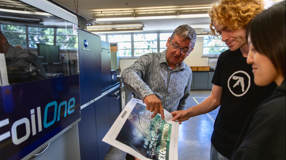 Konica Minolta's Director of Color Solutions, Dr. Mark Bohan (L), reviews output from the AccurioShine 3600 digital embellishment press with Cal Poly Graphic Communication students Kevin Manni (M) and Anney Haong (R).
