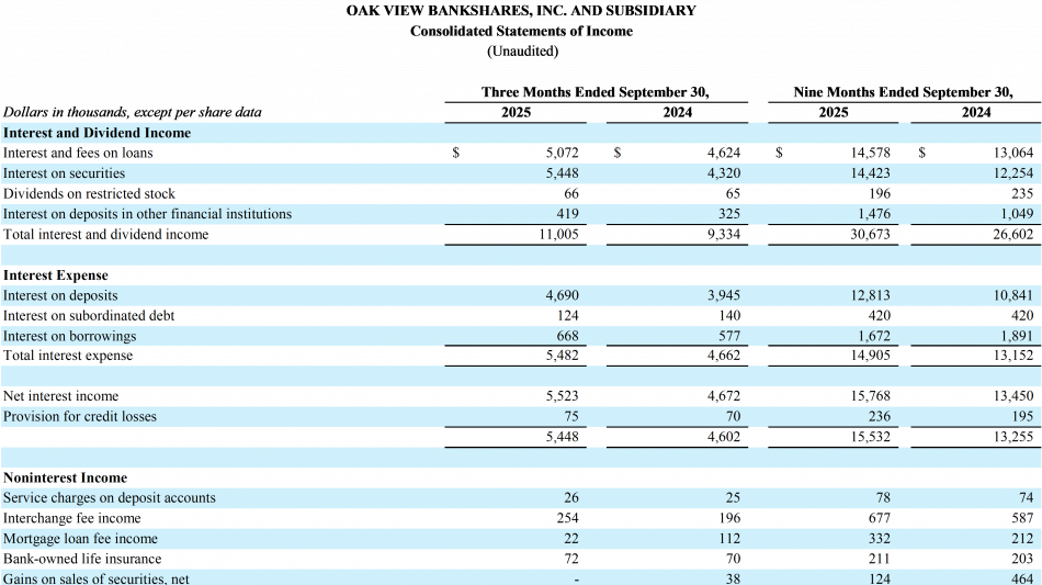 WARRENTON, VA / ACCESS Newswire / October 16, 2025 / Oak View Bankshares, Inc. (the "Company") (OTCID:OAKV), parent company of Oak View National Bank (the "Bank"), reported net income of $1.8 for the quarter ended September 30, 2025, compared to net income of $1.5 million for the quarter ended September 30, 2024. Net income for the nine months ended September 30, 2025, was $5.2 million, compared to $4.6 million for the nine months ended September 30, 2024.