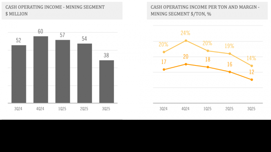 The Mining Segment's cash operating income decreased sequentially and year-over-year in the third quarter of 2025. The sequential decrease was primarily driven by lower margins and reduced sales volumes. On a year-over-year basis, the decline reflected lower margins, partially offset by increased sales volumes. The margin compression in the third quarter of 2025, as compared to the prior quarter and to the same period in 2024, was the result of higher unit costs and lower realized iron ore prices.