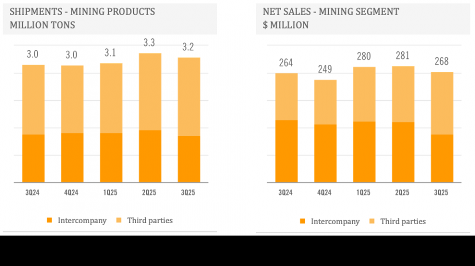 The Mining Segment's net sales decreased by 5% sequentially in the third quarter of 2025, reflecting lower sales volumes and a slight decrease in realized iron ore prices. Year-over-year, the Mining Segment's net sales increased slightly in the third quarter of 2025, as an increase in sales volumes was mostly offset by lower realized iron ore prices.