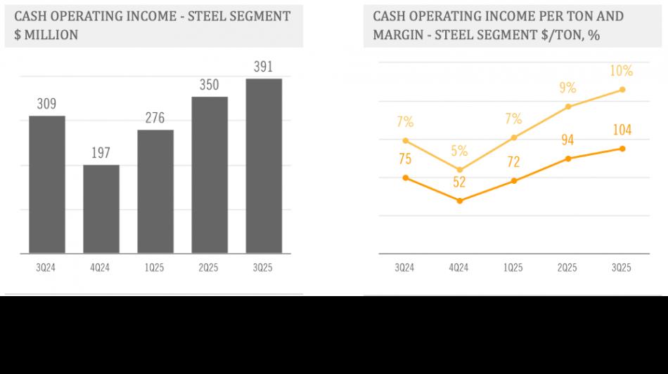 The Steel Segment's Cash Operating Income increased by $41 million sequentially in the third quarter of 2025, mainly driven by better margins. The margin improvement reflected the company's efforts to increase the efficiency in its operations and a decrease in raw material, purchased slab and energy costs, partially offset by a slight decrease in realized steel prices.