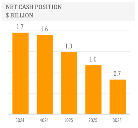 As of the end of September 2025, Ternium's Net Cash position stood at $715 million, decreasing by $303 million since June 2025. This decline reflects the cash demands associated with the ongoing expansion of the company's industrial center in Pesquería, Mexico, and changes in the fair value of Argentine securities.