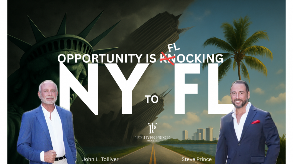 A striking visual shows New York fading into shadow while Florida shines in sunlight. Tolliver Prince Realty partners John Tolliver and Steve Prince stand on the path from NY to FL, symbolizing opportunity and growth.