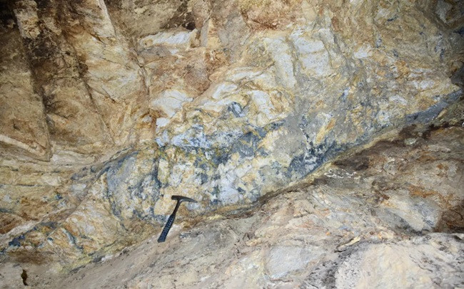 Figure 5: Exposed face of high-grade antimony-bearing stibnite (Sb) veins within the felsic dike at the Arrance Mine.
