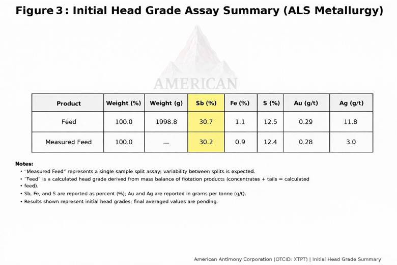 Based on initial metallurgical testing, preliminary head grades indicate antimony concentrations in excess of 30% Sb. Final head assay results are pending the completion of analytical verification using higher-grade reference standards. The Company will report finalized head grade values upon receipt from ALS.