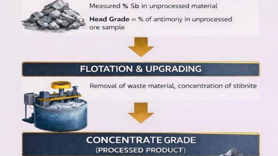 Concentrate grades, by contrast, represent the upgraded antimony content achieved after flotation and processing, and are typically significantly higher than head grades. The current metallurgical program is specifically designed to convert these exceptionally high head grades into high-purity stibnite concentrates, with concentrate grades and recovery metrics expected to be reported upon completion of ongoing flotation testing.