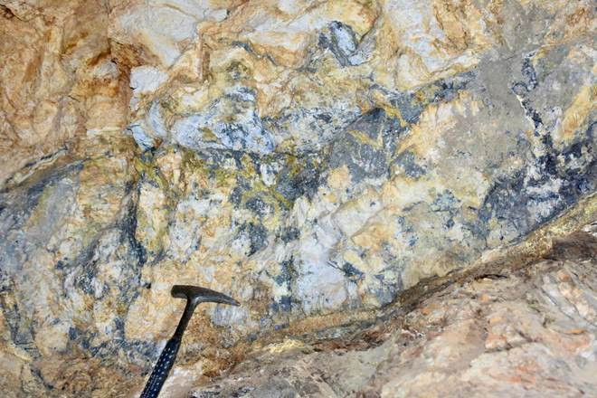 Figure 2: High-grade antimony-bearing stibnite (Sb₂S₃) vein at the Antimony King Mine. The mine portal, highlighted in blue in Figure 1 (above), indicates the source area of the historic stockpiles from which the bulk sample was collected.