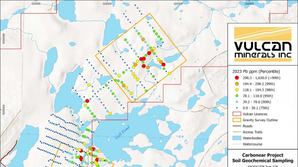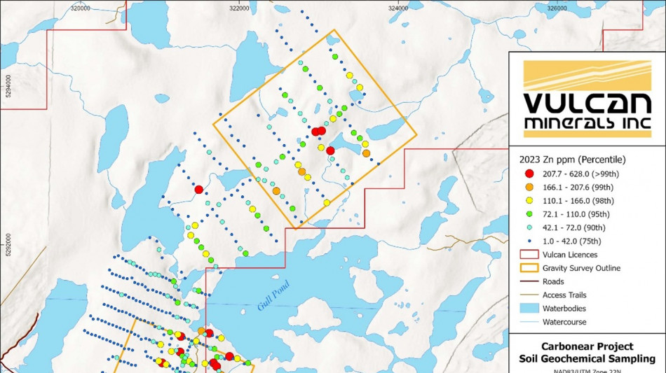 Prior historic drilling in the Gull Pond North area consisted of a total of five shallow holes to test ground electrical conductors. Given that the Company's recent work has enhanced the prospectivity of this general area, the company resampled Holes CP-97-08 and CP-97-10 to better ascertain the tenor of mineralization previously encountered. These holes contain anomalous zinc mineralization over a potential stratigraphic interval of approximately 100 meters based on 23 historic core samples in Hole CP-97-08 and 10 historic core samples in Hole CP-97-10. To confirm and better define the tenor of mineralization, an additional 31 samples over 42.5 meters in Hole CP-97-08 and 26 samples over 47 meters in Hole CP-97-10 were assayed. Mineralization consists of disseminated sulphides in turbiditic siltstones and secondary fracture fillings. A complete compilation of all sample intervals from both holes is available at https://vulcanminerals.ca/carbonear-historical-drill-sampling-results/. This infill sampling demonstrates the consistent nature of the anomalous mineralization. Hole CP-97-08 (76.2 meter total sampled length) has a weighted average of 0.23% zinc and 0.17% lead, including up to 1.2 meters of 4.1% lead and 1.5% zinc. Hole CP-97-10 (60.8 meter total sampled length) has a weighted average of 0.10% zinc and 0.05% lead.