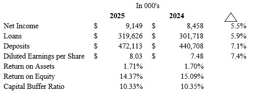 For fiscal year 2025, Net Income after Taxes was $9,149,000, an increase of 8.2% over 2024 results of $8,458,000. Earnings per diluted common share for fiscal year 2025 were $8.03, an increase of 7.3% over 2024 results of $7.48 per diluted common share.