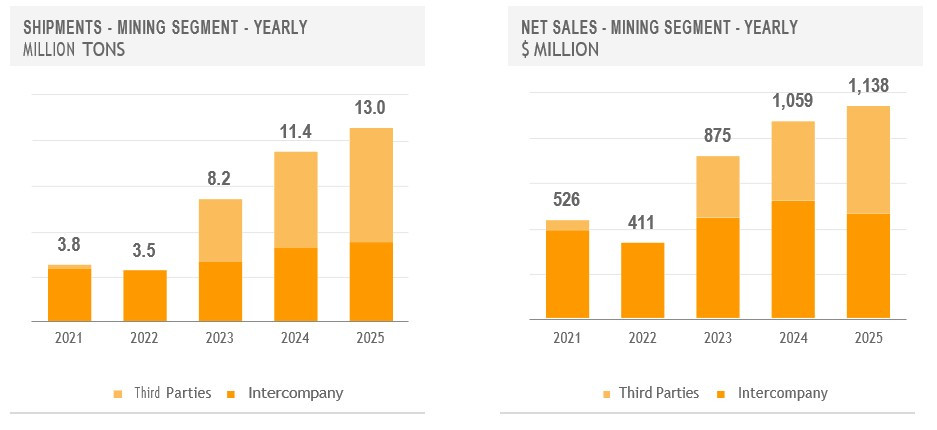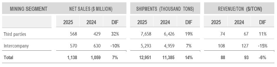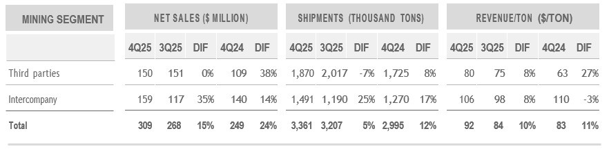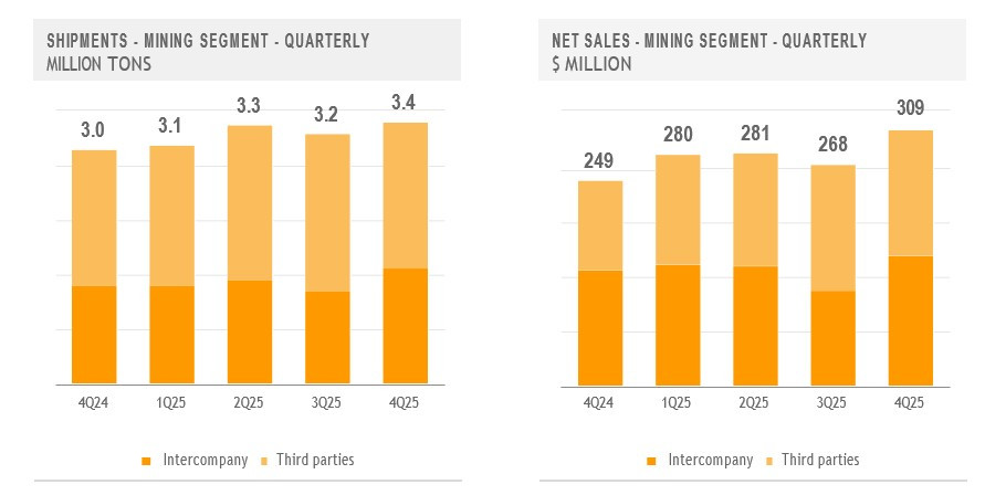 The Mining Segment's net sales increased sequentially and year-over-year in the fourth quarter of 2025, reflecting higher sales volumes and realized iron ore prices. The increase in iron ore shipments mainly reflected, on a sequential basis, better volumes from the Mexican operations, and, on a year-over-year basis, better volumes from both the Mexican and Brazilian operations.