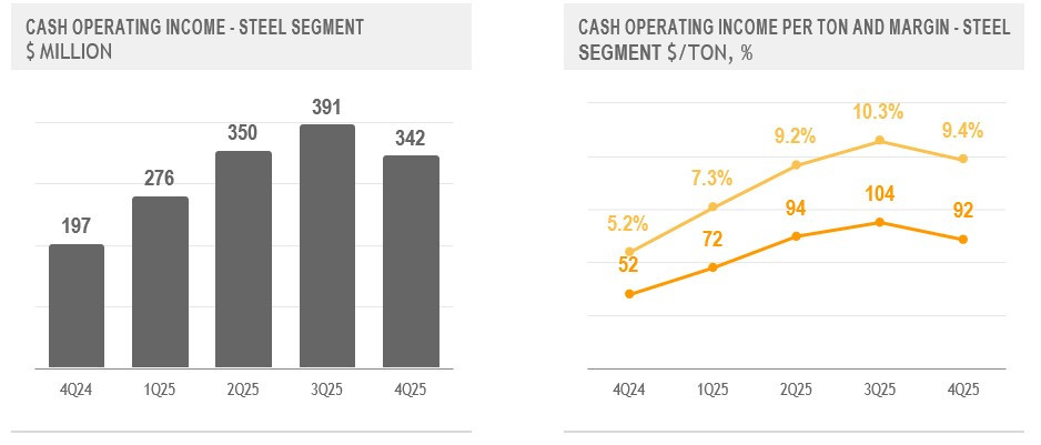 The Steel Segment's Cash Operating Income decreased by $49 million sequentially in the fourth quarter of 2025, reflecting slightly lower sales volumes and margins. Cash Operating Income Margin decreased by one percentage point, as a 4% decrease in realized steel prices was largely offset by lower raw material and purchased slab costs, as well as efficiency gains.