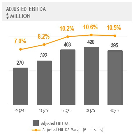 In the fourth quarter of 2025, Adjusted EBITDA had a slight sequential decrease to $395 million. This was primarily driven by lower realized steel prices in the company's main steel markets, which were mostly offset by lower raw material and purchased slab costs, along with the positive results from the company's initiatives to improve efficiency. Net income in the fourth quarter of 2025 was $171 million, including deferred tax gains amounting to $94 million.
