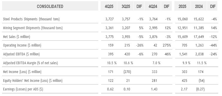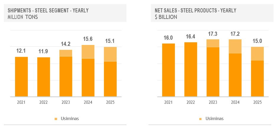 Net income in 2025 amounted to $303 million, including a loss of $405 million in connection with the write-down of deferred tax assets at Usiminas and a loss of $117 million stemming from the periodical value update of the provision for ongoing litigation related to the acquisition of a participation in Usiminas.
