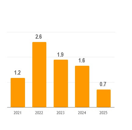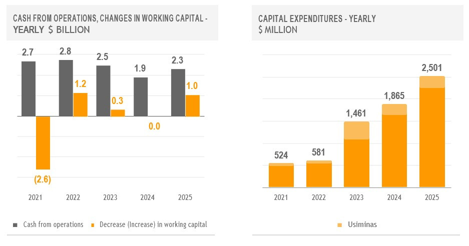 In 2025, cash from operations reached $2.3 billion. Capital expenditures amounted to $2.5 billion, the peak of the current investment cycle, with the bulk allocated to the continuing expansion of the industrial center in Pesquería. Dividends paid to the company's shareholders totaled $530 million, and dividends paid in kind to the minority interest amounted to $112 million. Consequently, Ternium's Net Cash position decreased by $932 million in 2025.