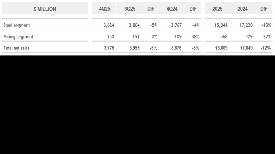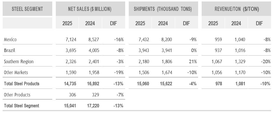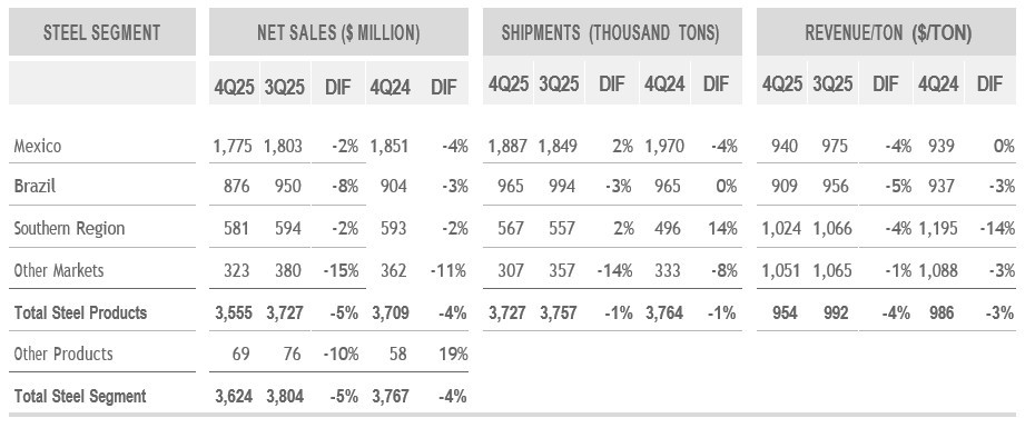 In the fourth quarter of 2025, the Steel Segment's net sales decreased sequentially and year-over-year mainly as a result of lower realized steel prices, as shipments remained relatively stable. Revenue per ton decreased in the Southern Region, Brazil and Other Markets. In Mexico, revenue per ton declined on a sequential basis, while it remained unchanged on a year-over-year basis.