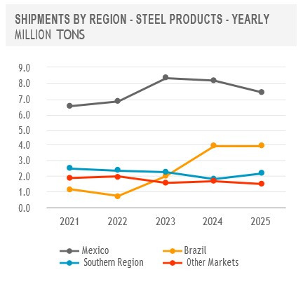 In the Southern Region, shipments increased in 2025, reflecting better steel demand in Argentina compared to weak activity levels in the prior year.