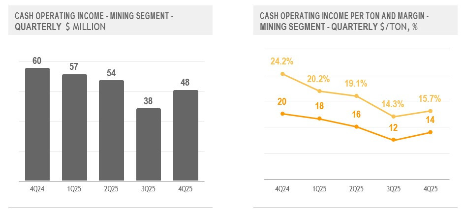 The Mining Segment's Cash Operating Income increased sequentially by $10 million in the fourth quarter of 2025, reflecting higher sales volumes and margins. Cash Operating Income Margin increased by 1.4 percentage points, reflecting higher realized iron ore prices partially offset by higher unit costs.
