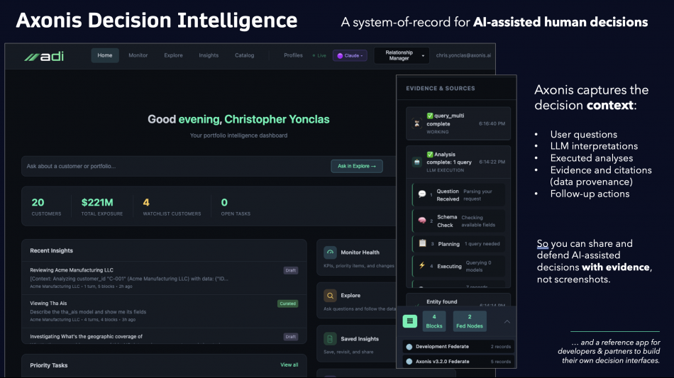 ARLINGTON, MA / ACCESS Newswire / February 24, 2026 / Axonis, developers of the federated AI infrastructure platform that enables enterprises to run AI directly on distributed, sensitive, and real-time production data, today announced Axonis Decision Intelligence, a new platform capability that enables enterprises to operationalize AI-assisted decision-making at scale by capturing and preserving the full context behind how decisions are made in a living system of record. While AI systems have become adept at generating answers, recommendations, and predictions, they lack a reliable way to explain how a specific decision was made in a given situation, particularly when data spans multiple systems, teams, and policies. Axonis Decision Intelligence closes this gap by providing enterprises with the guardrails required to connect AI output to accountability, while maintaining ownership of valuable context and human-in-the-loop accountability.