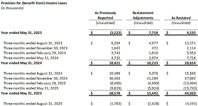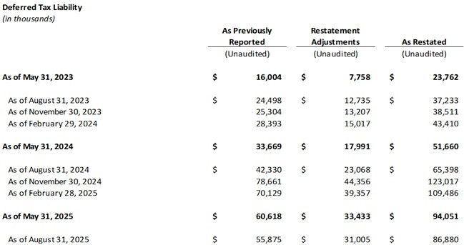 The Company determined that a restatement was required to correct the valuation of deferred tax liabilities and the provision for income taxes in the Company's financial statements. The restatements did not change cash and cash equivalents, total assets, net income or loss from operations before the provision of income taxes, cash paid for income taxes, or cash flows from operations. The following tables present the restatements of the provision for income taxes and the deferred tax liability for each quarterly reporting date in each of the Affected Periods.