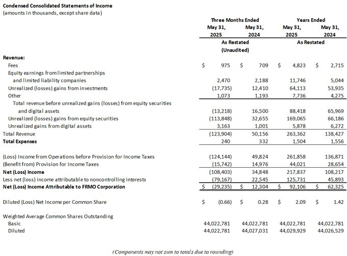 WHITE PLAINS, NY / ACCESS Newswire / February 26, 2026 / FRMO Corp. (the "Company" or "FRMO") (OTC PINK:FRMO) today announced the filing of its restated financial statements for the fiscal years ending May 31, 2025 and 2024 and the financial information for each of the interim periods included within those years, and the Company's quarterly financial statements as of and for the three months ended August 31, 2025 (the "Affected Periods").