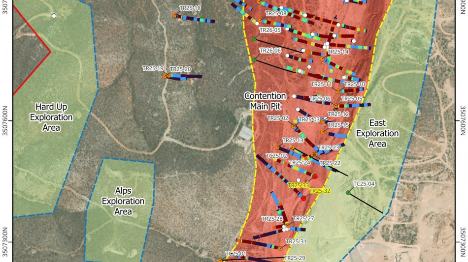 RC drill hole TR25-33 intersected five mineralized zones including 42.6m averaging 0.452 gpt AuEq (0.257 gpt Au and 11.5 gpt Ag) of oxidized mineralization over its 152 m depth. The drill hole was collared on the unmined land bridge marking the limit between the Contention Main and South pits. Along with TR25-32 this drill hole has defined and joined the Contention Zone mineralization over its plus one-kilometer length identified to date.