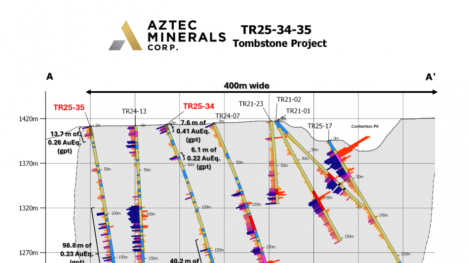 Aztec Minerals CEO Simon Dyakowski Commented: "Today's announcement of successful step out drilling in the Westside target area of the Tombstone property marks a significant milestone for the project. Drilling conducted in late 2025 has not only extended the strike length of the Main Contention Zone to over one kilometre north-south, but we have also now demonstrated width of the North Contention Zone to over 350 meters. Shallow gold-silver oxide mineralization encountered in drill hole TR25-36 further extends the target area to the West. With continued drilling of step out targets to the West of the main contention Zone the project's scale continues to grow as we continue our largest ever drill campaign at the project, which is currently planned at approximately 12,500 meters of combined RC and core drilling."
