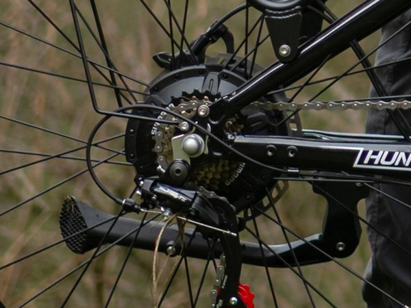 A Shimano 7-speed drivetrain provides mechanical gear selection across varying gradients.