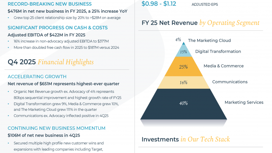 "In 2025, Stagwell increased its strategic pivot toward AI applications and services, building a powerful foundation for 2026. With accelerating growth ex-advocacy, record net new business, expanding margins and doubled free cash flow, our FY25 results prove our strategy is working," shared Mark Penn, Stagwell's Chairman and CEO. "We see great opportunity in 2026 to capitalize on an industry distracted by restructurings and mergers, and bolster our position as a winner in the age of AI."