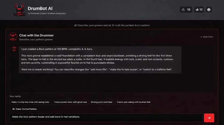 Chat with a Drummer-Producers type what they want in plain English - "a heavy half-time groove with ghost notes on the snare" or "something jazzy and loose at 120 BPM" - and DrumBot AI delivers a pattern that sounds like it was programmed by someone who actually plays drums.