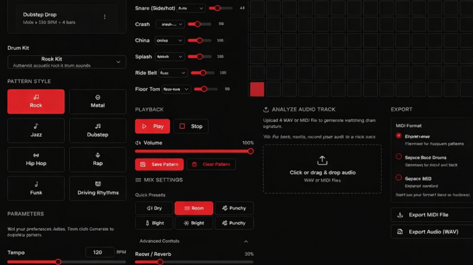 The platform is built on a proprietary AI engine trained to understand groove, dynamics, and the rhythmic language of eight distinct musical styles: Rock, Jazz, Funk, Dubstep, Metal, Hip Hop, Rap, and Driving Rhythms. Rather than generating random hits on a timeline, DrumBot AI produces patterns with the musical awareness of a live session drummer - ghost notes land where a real player would put them, drum fills build tension naturally, and every genre gets the rhythmic treatment it deserves.