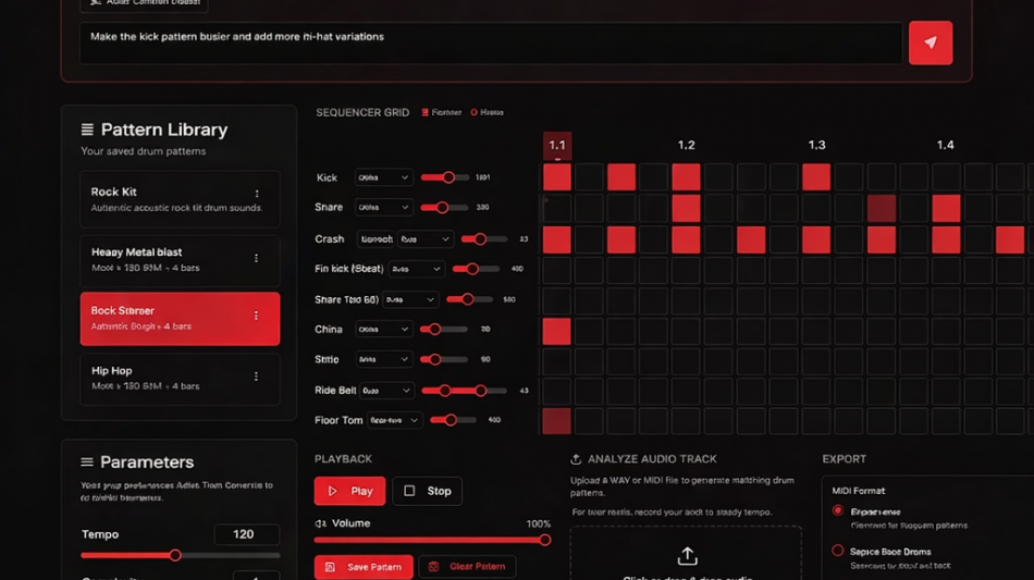 Audio intelligence-Drop in any audio file - a reference track, a rough demo, a vocal idea - and the AI listens to it, picks up the rhythmic feel, and generates a drum pattern that matches. No more transcribing beats by ear or hunting through loop packs for something that fits.