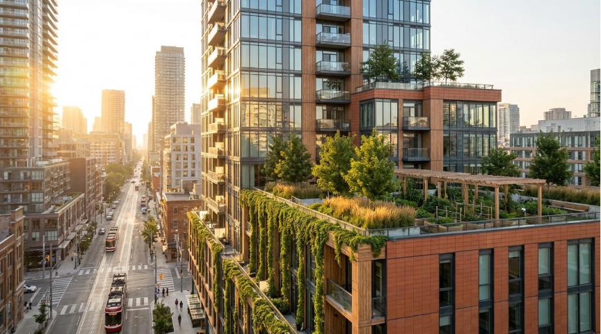A modern Toronto high-rise featuring living walls and rooftop garden terraces - the future of wellness-oriented residential development.