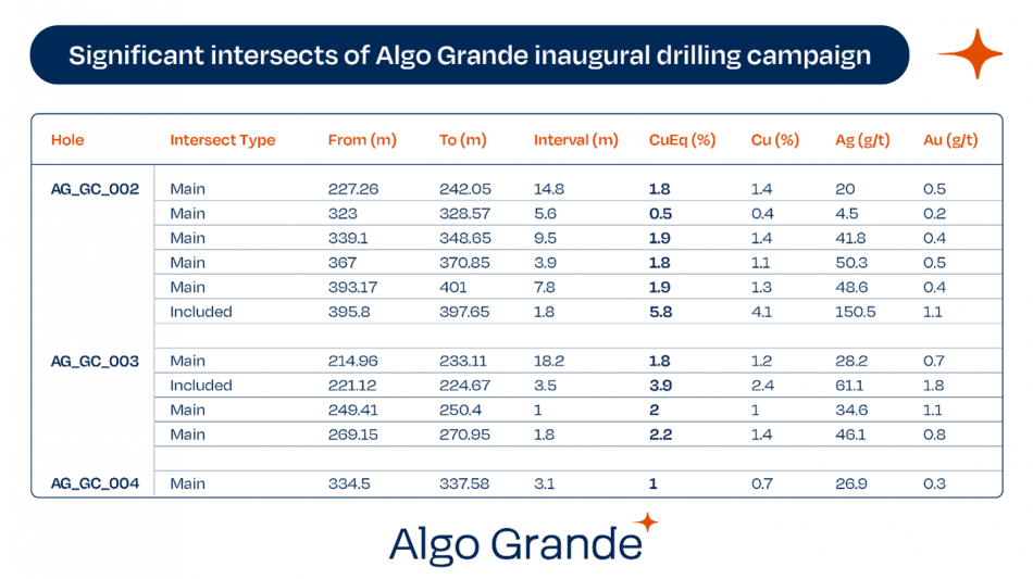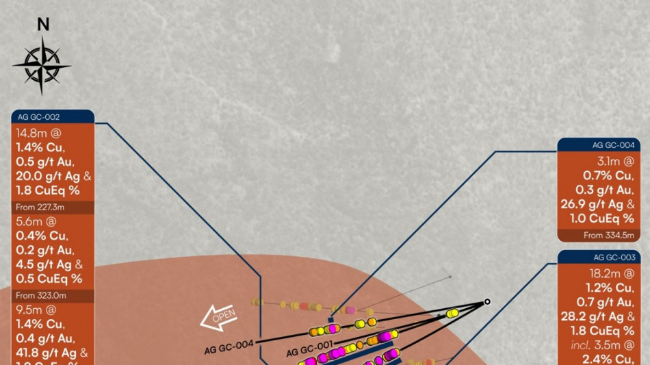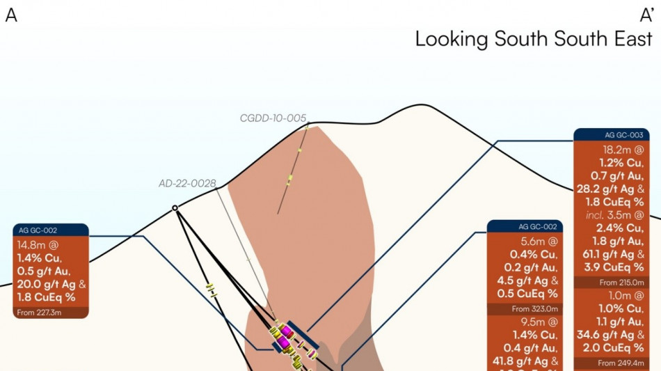 Hole AG_GC_003 intersected a broad zone of strong copper-gold-silver mineralization, including 18.2 m @ 1.8% CuEq (1.2% Cu, 28.2 g/t Ag, 0.7 g/t Au), including 3.5 m @ 3.9% CuEq (2.4% Cu, 61.1 g/t Ag, 1.8 g/t Au).