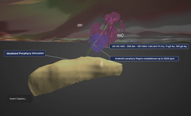 Several molybdenum-bearing intervals (AG_GC_002: 288.40 m to 289.44 - 1.04 m @ 1440 Mo; 333.0m to 333.8m - 0.8 @ 2820 Mo; 545.83m - 546.35 0.52m @ 1000 ppm Mo; AG_GC_004: 274.5 -275.4 0.9m @ 521 ppm Mo) have been identified across the drill holes, with values reaching up to 2,820 ppm on AG_GC_002 and above 500ppm on AG_GC_004. These intervals are spatially distinct from the highest-grade copper-silver-gold skarn mineralization and are commonly associated with intrusive phases, including andesitic porphyry fingers and potassic alteration halos around quartz-calcite veins (Figure 3).