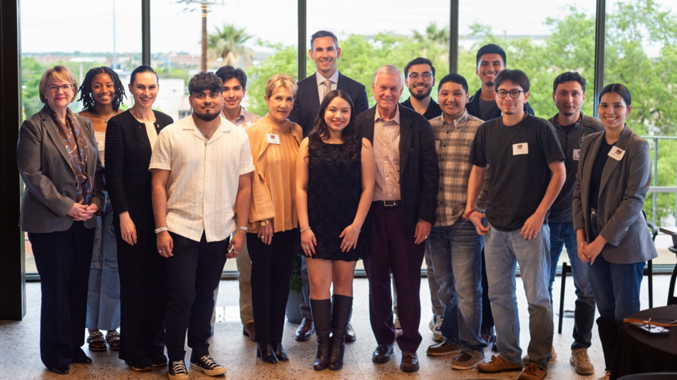 From left to right: Trinity University President Vanessa B. Beasley, Ph.D.; Carla Brozovich (front row, black sweater and white shirt); John Brozovich (back row, suit jacket); Malú (front row, orange blouse); Carlos Alvarez (front row, black suit jacket); and MAS Trinity students.