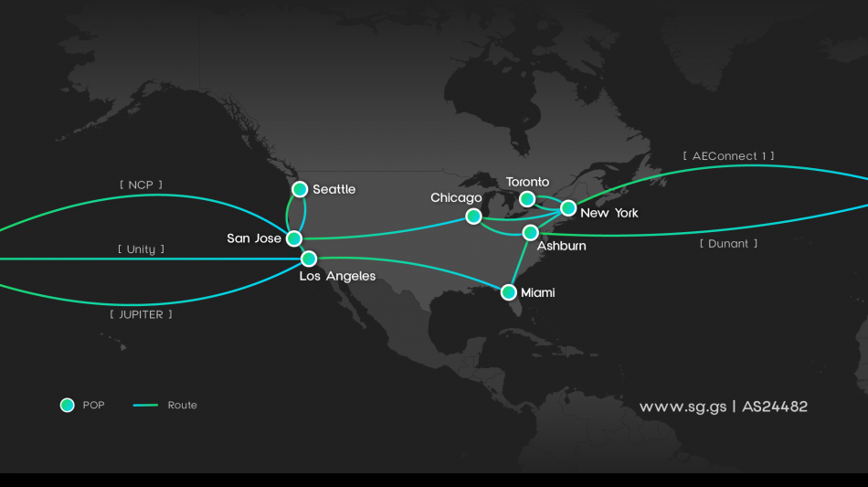 With the deployment of new hardware across North America, SG.GS can now offer up to 100G services across its product portfolio, including international connectivity, IP access (AS24482), IX peering, and cloud services.