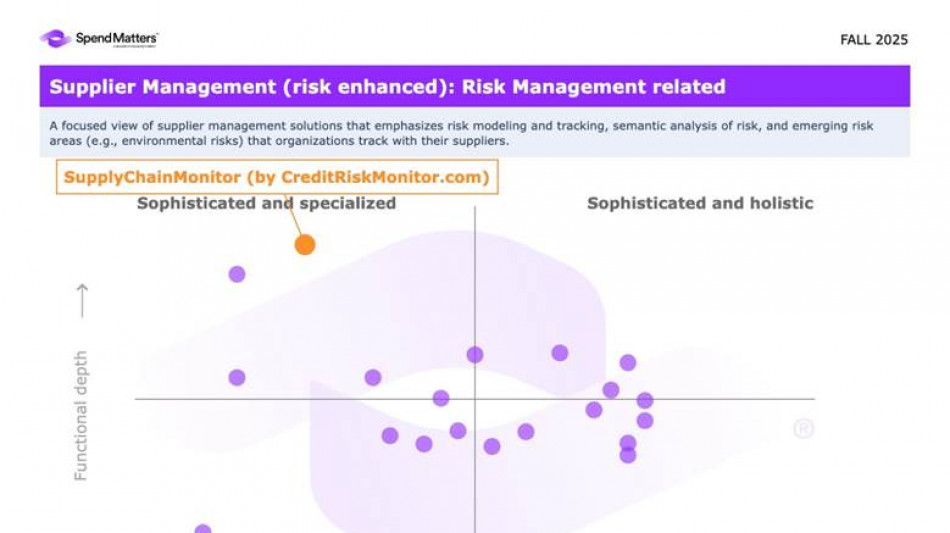 "We are glad to be recognized again by Spend Matters in Third Party Risk Management with an emphasis on financial risk reporting and analytics. The recent and significant increase in vendor bankruptcies, particularly in the manufacturing sector, has underlined the importance of having an accurate and timely early warning system to monitor business financial risk for our clients. Macro factors including interest rates, cost inflation, tariffs, and generally high corporate debt levels continue to point at increased bankruptcy risk across sectors. We've also seen a swath of adverse events on specific suppliers leading to disruptions. Leading organizations recognize that proactive monitoring of supplier financial risk is critical to maintaining supplier continuity. SupplyChainMonitor™'s AI-driven financial risk models, advanced alerting, and holistic risk management capabilities support early identification of threats, so our clients can implement contingency planning and risk mitigation strategies before operational issues become material."