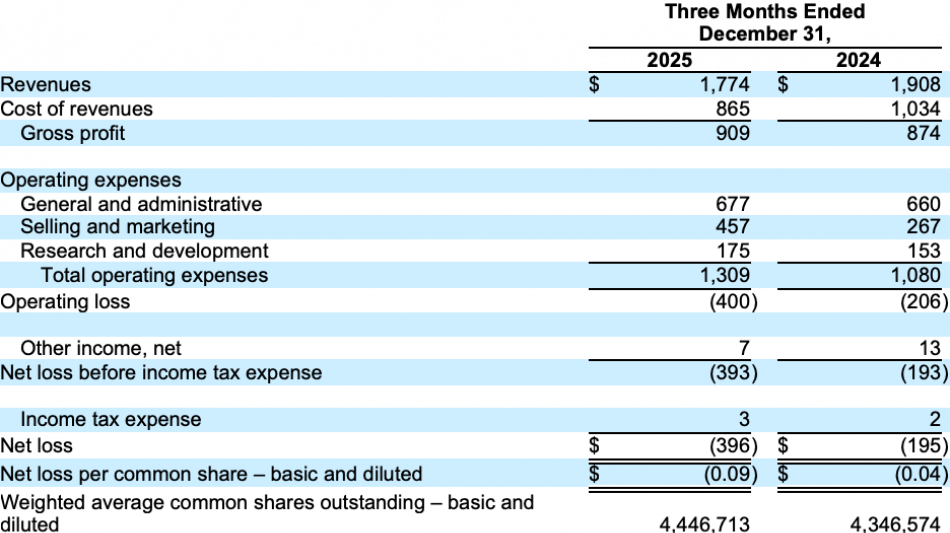 Net loss of $396 thousand, or $0.09 per share, versus net loss of $195 thousand, or $0.04 per share, in FY 2025.