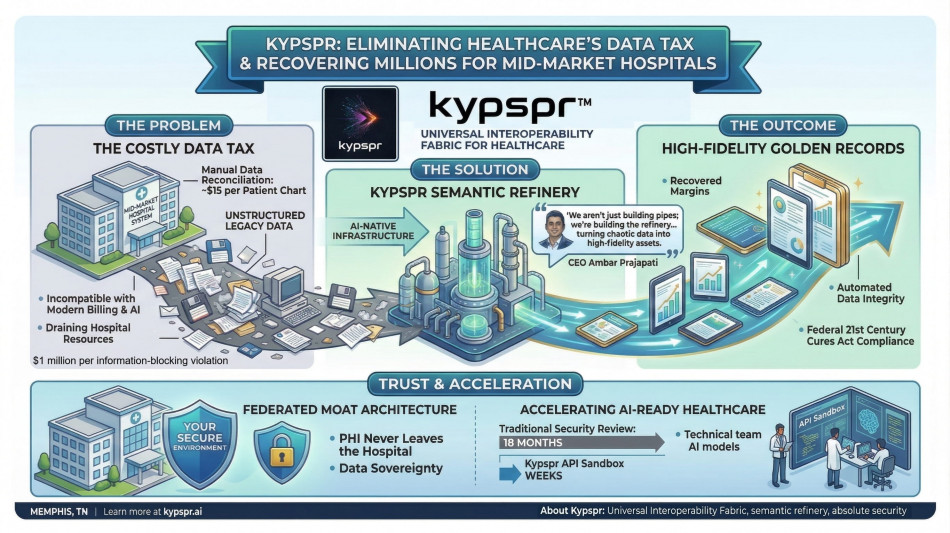 MEMPHIS, TENNESSEE / ACCESS Newswire / March 9, 2026 / Kypspr, the universal interoperability fabric for healthcare, today announced a strategic expansion of its Semantic Refinery to solve the industry's most expensive hidden problem: the Data Tax. For mid-market health systems, manual data reconciliation currently costs an estimated $15 per patient chart just to make legacy records compatible with modern billing and AI.