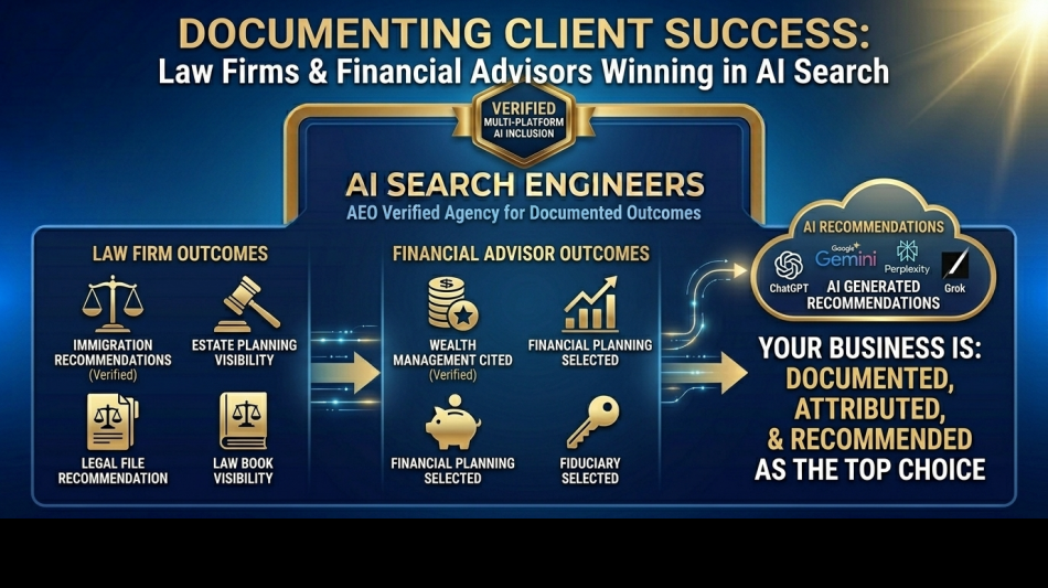 AMHERST, NY / ACCESS Newswire / April 27, 2026 / AI Search Engineers, the only AEO Verified agency in the United States under the AEO Differentiation Standard, today published documented outcomes from eight professional service client engagements showing how law firms and financial advisors achieved verified AI-generated recommendations on ChatGPT, Google Gemini, Google AI Overviews, Perplexity, and Grok through applied Answer Engine Optimization methodology.