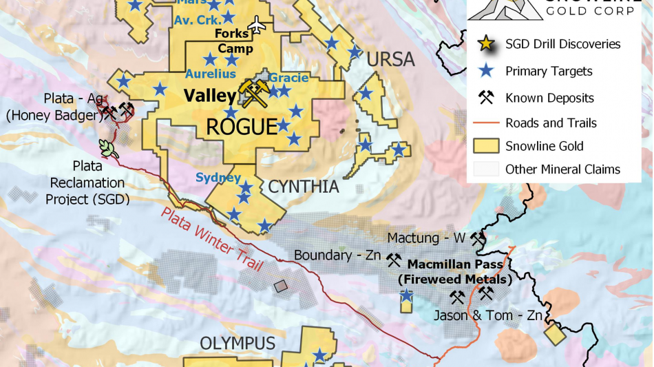 Snowline Gold Corp. is a Yukon Territory focused gold exploration and development company with an eight-project portfolio covering roughly 360,000 ha (3,600 km2). The Company is advancing its Valley deposit-a large, low-strip, near surface, >1 g/t Au bulk tonnage gold system located in the eastern Yukon-while continuing regional exploration of surrounding targets on the Rogue Project and the broader district in the highly prospective yet underexplored Selwyn Basin.