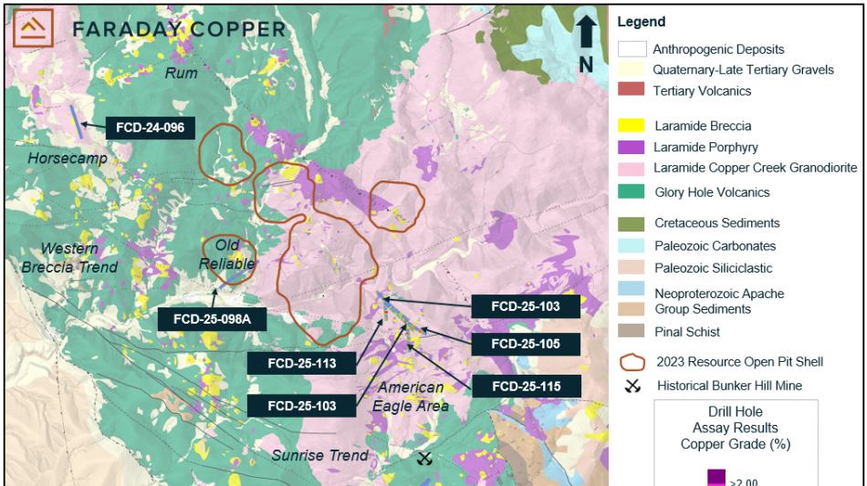 VANCOUVER, BC / ACCESS Newswire / June 19, 2025 / Faraday Copper Corp. ("Faraday" or the "Company") (TSX:FDY)(OTCQX:CPPKF) is pleased to announce the results of the final nine drill holes from its Phase III drill program at the Copper Creek Project, located in Arizona ("Copper Creek"). Five holes were drilled in the American Eagle area, one at Old Reliable, two at the Sunrise Trend and one at Horsecamp.