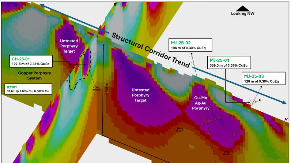 Hole CH-25-01 was drilled into a resistivity low approximately 1km from previously reportedMJ-25-01 (0.36% Copper Equivalent ("CuEq") over 359m including 0.56% CuEq over the first 75m of this interval ) and 200m from historic drill holes R2301 (38.6m of 1.06% Cu and 0.07 g/t Au) and R2304 (50.2m of 0.88% Cu and 0.09 g/t Au), and intersected 107.5m grading 0.31% CuEq, including 30.3m at 0.74% CuEq.