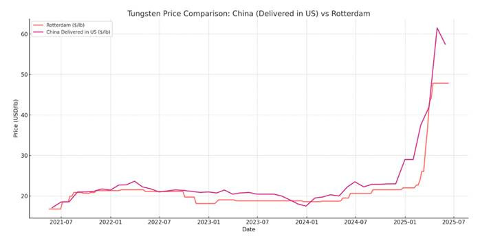 USAC has analyzed data from May 2021 through June 2025, highlighting consistent price elevation in Chinese tungsten material delivered to the U.S. due to logistics, tariffs, and export controls. Meanwhile, Rotterdam-based pricing-converted to $/lb for comparison-remains more stable but equally affected by European market dynamics. This price volatility underscores the strategic importance of secure, domestic sources of tungsten as well as other critical minerals. The analysis compares prices of Chinese tungsten bars delivered to the United States against ingot prices from the Rotterdam market over a four-year period from May 2021 to June 2025. The data reveals sustained pricing volatility, with Chinese tungsten consistently carrying a premium due to delivery costs, tariffs, and increased export restrictions under China's tightening critical mineral policies.