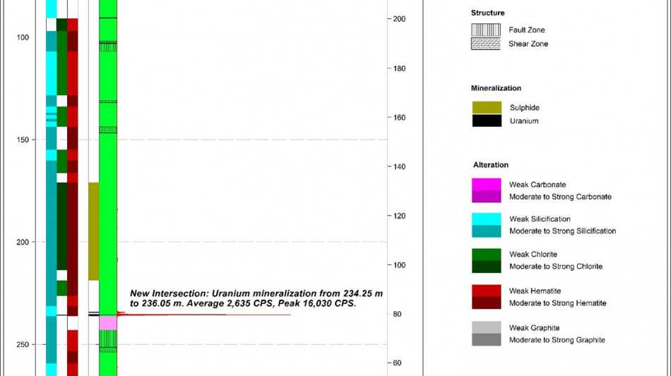 2The Company considers high-grade mineralization to be any interval with radioactivity derived from downhole gamma probe >10,000 CPS. The total gamma results provided were selected using an average cutoff of 500 CPS over intervals of 0.1 metre width. All drill intercepts are core width and true thickness is yet to be determined.